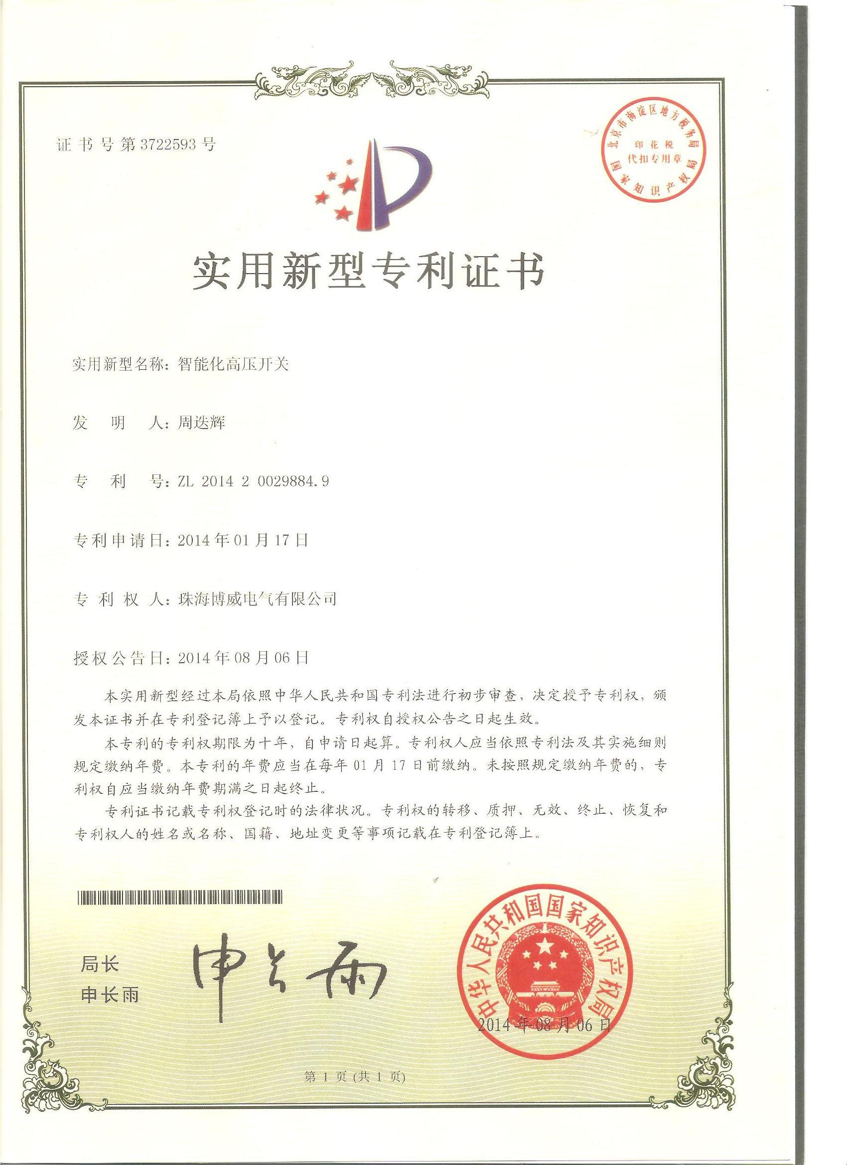 高新技術產品證書